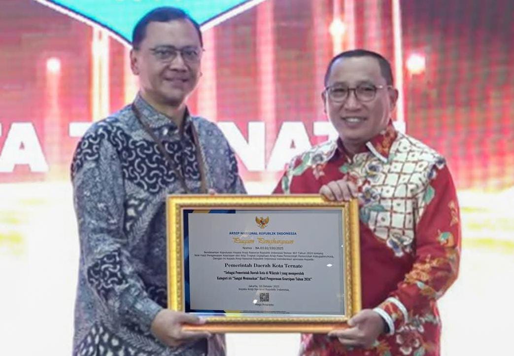 Jakarta – Pemerintah Kota (Pemkot) Ternate kembali menorehkan prestasi membanggakan di tingkat nasional. Tahun 2024, Pemkot Ternate berhasil meraih Penghargaan Penyelenggaraan Kearsipan sebagai Pemerintah Daerah Kabupaten/Kota dengan peringkat XIV nasional, serta memperoleh kategori AA (Sangat Memuaskan) berdasarkan hasil pengawasan kearsipan tahun 2024 oleh Arsip Nasional Republik Indonesia (ANRI).