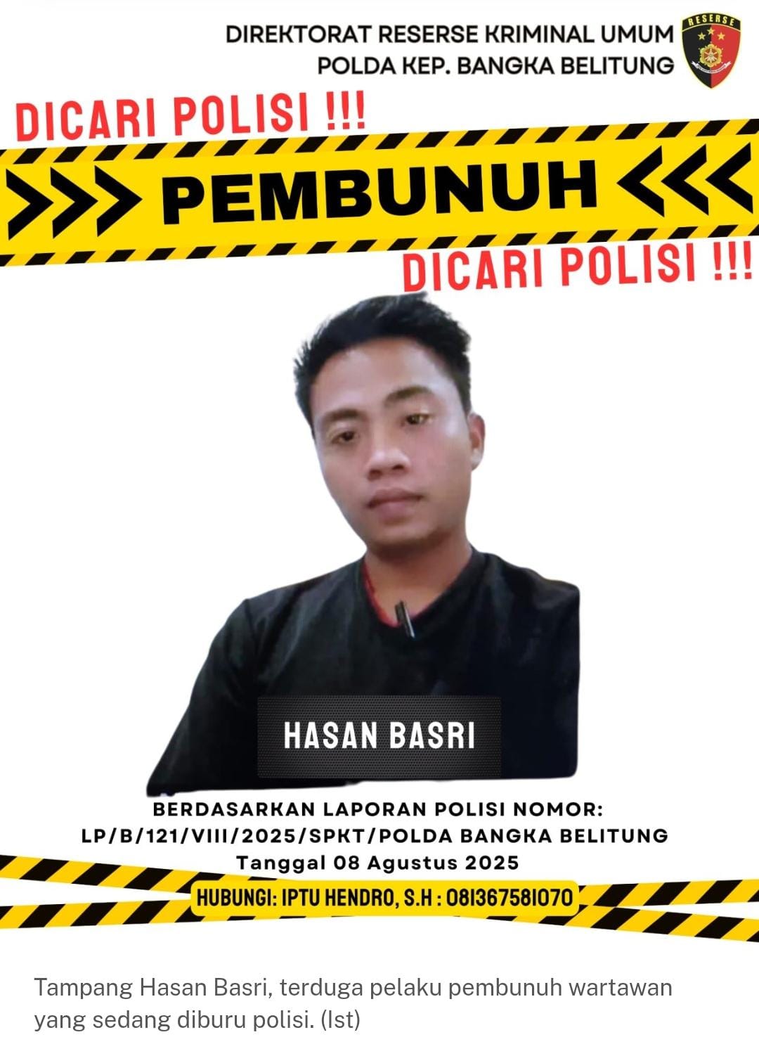 Berdasarkan Laporan Polisi Nomor: LP/B/121/VIII/2025/SPKT/POLDA BANGKA BELITUNG, tertanggal 08 Agustus 2025, Direktorat Reserse Kriminal Umum Polda Kepulauan Bangka Belitung saat ini tengah memburu Hasan Basri, yang diduga sebagai pelaku pembunuhan terhadap wartawan Adityawarman.