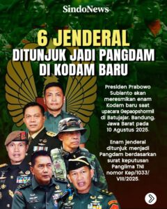 Enam jenderal tersebut telah ditunjuk berdasarkan Keputusan Panglima TNI Nomor Kep/1033/VIII/2025 untuk memimpin kodam-kodam baru tersebut.